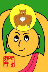 馬頭観音(めとうかんのん)何十年か前師の山坊に通い始めたころ縁側に泥仏が置いてあった。「ばとうかんのん」ですかと訪ねると「めとうかんのん」と呼んでくださいと教えていただいた。馬頭観音様は馬が煩悩を食い尽くし悪縁や悩みを断ち切るご利益があるとAIが教えてくれる。薬師如来を守られる十二神将の珊底羅大将(さんてらたいしょう)が午年に当たると奈良国立博物館のwebサイトに紹介されている。で頭に馬を戴いた観音様を描こうとお馬さんを作画、しかし彼の技術では上手く思う位置におさまらなかった。ところが円の中には綺麗に入られたのでそのままお釈迦様が両手で持ち上げた姿になりました。まるで昨年アメリカMLBでドジャースが優勝し最優秀選手に山本由伸投手が選ばれロサンゼルス空港でトロフィーを持ち上げられたように。午年午年午年で思い出したのが「左馬」の茶碗直径10pほどの手のひらに収まる大きさで、山坊によく来られる方が自宅に窯を作られ初焼きの記念には馬の字を逆さに書いた茶碗をと師に依頼された。赤茶の土に白い釉薬を掛ける際釉薬をはじく液体を筆で「左馬」「美土里」と窯の名前を書かれた。後日字の部分だけが土色の茶碗が送られてきてその場に居合わせた夜学の連中に配られた。素早く手に入れた彼は桐箱を用意して師に箱書きをしてもらいそのままお蔵入り。午年だから三十六年ぶりかと箱から取り出し白い釉薬だから抹茶の緑が綺麗と思いつつ、いや般若湯のほうがアンタさんにはお似合いか、でもいただいた翌朝は馬足ならぬ千鳥足でサノヨイヨイ。忘れちゃいけない「不飲酒戒」はどうするの、両手を挙げて万歳三唱。ウフフ