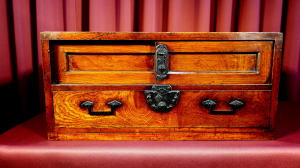 特徴 知工箪笥とは北前船で会計担当が帳簿などの収納と机を兼ねた箪笥です。特にこの帳場知工箪笥は引き戸がついた数少ない箪笥です。又枠は総欅蟻組で知工箪笥独特の細工が施してあります。使い込まれた天板の傷は骨董大好きな方にはたまらない逸品です、長く手元に置いてお楽しみください。鍵は使用できますが時代が古いため錆びついていますので開錠にはつまみを押しながら左回し(一方向のみ)で開錠してください。
